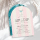 Este convite de chá de noiva "sip & dip" retrô apresenta um coquetel em um fundo creme com listras rosa claro. O verso apresenta um fundo verde escuro com um padrão de folhas de palmeira. Personalize-o para suas necessidades. Você pode encontrar produtos correspondentes na minha loja.