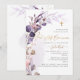 PixDezines Convite para Primeira Comunhão, com exuberante folhagem verde em tons de roxo empoeirado e eucalipto, além de folhagem de outono, uma cruz dourada falsa, poeira dourada e moldura acentuada com caligrafia de luxo. Todos os elementos são editáveis e removíveis.