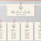 Placa de Cabeçalho de Gráficos de Mesa de Casamento de Destino Moderno da Shell Beach Ocean Minimalista. Todos os textos estão pré-organizados para que você personalize fácil e rapidamente com seus próprios detalhes.