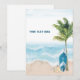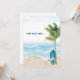 Este cartão de sinalização de surfe retrô azul é perfeito para um chá de bebê com tema de praia ou surfe. O desenho do surfboard e da praia em aquarela azul cria o cenário para uma atmosfera tropical.