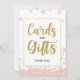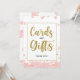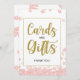 Este moderno sinal de chá de panela "Cartões e presentes" floral apresenta um fundo floral cor-de-rosa com salpicos de brilho do ouro. O texto é escrito em uma mistura de uma fonte de caligrafia lúdica e uma fonte moderna de sans.