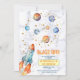 Planetas em aquarela com um foguete decolando na frente de nuvens suaves. Decolagem! para celebrar sua ocasião especial com este design adorável.