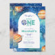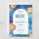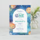 Watercolor First Trip Around the Sun - Primeiro convite de aniversário com planetas numa galáxia espacial colorida.
