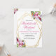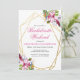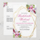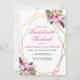 Flores tropicais em aquarela rosa e roxo dentro de uma moldura geométrica dupla dourada apresentam floreios botânicos e festivos. Personalize este convite de despedida de solteira com suas próprias cores e fontes ou mantenha esta tipografia popular como está para sua conveniência. Misture e combine com outros itens desta linda coleção de casamento.