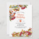 Convite elegante e moderno com ramos e folhas brilhantes do outono (rugem, dogrose) e ilustração de aves. Fundo de faixas verdes verticais Shabby. Perfeito para todas as ocasiões e feriados: aniversário, chá de fraldas, casamento, salvar a data, férias de outono e outros. Adicione seu texto.