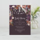 Concurso de Chá de fraldas leve de Corda Floral Dourada, ameixa. Este maravilhoso convite de chá de fraldas é perfeito para seu evento especial! Este design apresenta lindas, ricas plumas, roxas, rosa e douradas flores em um fundo de ameixa com luzes de cordas mágicas. A tipografia personalizada é moda e elegante!