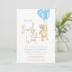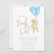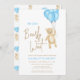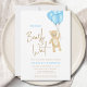 O convite de chá de fraldas deste rapaz encantador apresenta balões azuis de aquarela e um ursinho de pelúcia com as palavras "Nós podemos esperar mais cedo" na tipografia de na moda. É facilmente personalizável. Original Watercolor © Michele Davies.