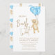O convite de chá de fraldas deste rapaz encantador apresenta balões azuis de aquarela e um ursinho de pelúcia com as palavras "Nós podemos esperar mais cedo" na tipografia de na moda. É facilmente personalizável. Original Watercolor © Michele Davies.