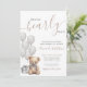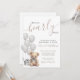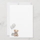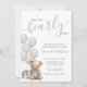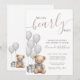 "Mal podemos esperar" define o tom deste convite de chá de bebê encantador e neutro em termos de gênero, perfeito para celebrar os futuros pais e seu pequeno. Apresentando balões de aquarela cinza suave, um ursinho marrom fofo com um laço cinza correspondente e uma caixa de presente coordenada, este design é doce e atemporal. O urso tem um filtro cinza sutil aplicado, o que realça a aparência neutra. Se preferir uma versão mais vibrante do urso, pode remover facilmente o filtro no editor: clique no 'grupo' da arte, selecione o urso e, no canto superior direito, altere a configuração do 'filtro' para 'nenhum'.