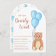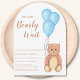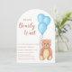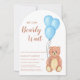 O convite para a arca de chá de fraldas deste rapaz é decorado com um ursinho de pelúcia e balões azuis. O texto marrom diz "We Can Barly Wait" na tipografia de na moda. Facilmente personalizável. Original Watercolor © Michele Davies.