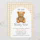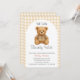 Um chá de fraldas temático "We Can Barly Wait" com ursinho giro vestindo roupa de xadrez de designer de luxo em cores castanhas, beges e fundo de gingham. Você pode personalizar isso facilmente com seus detalhes.