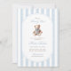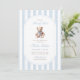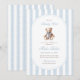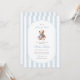 Um doce acento à tradição com um toque de charme de eterno. Este convite para o chá de fraldas do milênio apresenta listras de aquarela azul macia, um ursinho de pelúcia estilo vintage, e tipografia elegante — perfeita para celebrar um pequeno cavalheiro no caminho.