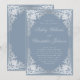 Este convite de casamento elegante em azul empoeirado e prata com um ar vintage tem tudo: "algo velho, algo novo, algo emprestado, algo azul". A moldura de prata falsa ornamentada vintage é "emprestada" de uma encadernação de capa de livro antigo, de Georges Mercier (1885-1939): Madame de Maupin de Theophile Gautier, edição de 1911, agora em domínio público. O fundo azul tem uma nuance nova e moderna chamada "azul empoeirado".