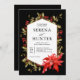 Um convite de casamento elegante e clássico com tema de inverno, perfeito para casamentos durante a temporada de Natal, este design apresenta uma moldura geométrica hexagonal bordejada a ouro e rodeada por azevinho e frutos vermelhos com uma adorável poinsétia vermelha no canto inferior. Um layout de texto moderno com uma combinação de texto serifado elegante emparelhado com texto de caligrafia manuscrita dá ao design um apelo adicional. Este convite tem um fundo preto para contrastar lindamente com os pinheiros e a poinsétia.