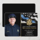 This design features a police force flag with black and white stripes, and a thin blue line stripe as well. The police badge and gold text sits above all of the party details for the retiring law enforcement officer, sheriff, captain, or chief. Customize further with a photo of the new retiree.