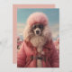 Imagem engraçada de um Poodle Rei no Polo Norte usando um casaco de inverno rosa fofo e óculos de neve