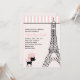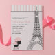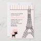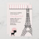 Convites de festas de aniversários adoráveis apresentam uma ilustração vetorial fofinha de um poodle francês cor-de-rosa e preto e a Torre Eiffel em um plano de fundo de listras rosa e branca.