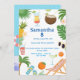 Dive into summer fun with this charming pool party invitation! Featuring a delightful cartoon design with lounge chairs, flip-flops, tropical cocktails, and palm trees in soft watercolor shades, this 5x7 card sets the perfect tone for a girl's 8th birthday celebration by the pool.