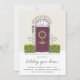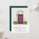 Um convite encantador para festas de férias apresenta uma ilustração de porta vermelha esboçada, flanqueada com arbustos verdes, com a inscrição manuscrita de "casa de férias aberta". Personalize com seus detalhes da festa de Natal embaixo.