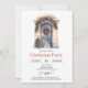 Design de Warmish para convite de festas de Natal apresenta porta azul-aquarela clássica, decorada com arco vermelho e coroa de Natal com amoras ocas vermelhas com tipografia moderna em um fundo branco.