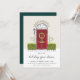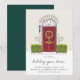 Um convite encantador para festas de férias apresenta uma ilustração de porta vermelha esboçada, flanqueada com arbustos verdes, com a inscrição manuscrita de "casa de férias aberta". Personalize com seus detalhes da festa de Natal embaixo.