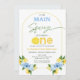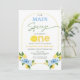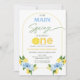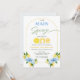 Positano Blue Lemon Nosso primeiro aniversario de aperto principal Convite para o limão doce O primeiro convite para o aniversário de uma menina com flores azuis, alguns limões, arco de linha e um título de caligrafia moderno. Esse convite principal de primeiro aniversario de aperto também apresenta uma palavra decorativa que soletra uma com fatia de limão.