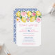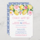 Convite de (casamento) recepção apenas com limões aquarela e flores cor-de-rosa, complementado por azulejos azuis e brancos no verso. Isso foi projetado para convidar os convidados para uma grande celebração de casamento, tendo tido apenas uma pequena cerimônia de casamento com poucas pessoas presentes.