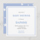 Chá de fraldas azul com estrelas brancas O modelo tem um tema azul. O modelo de design contém um texto azul colorido que é facilmente alterado para suas informações. Escolha entre uma faixa de tipos de papel. O reverso tem estrelas brancas se repetindo sobre um fundo azul.