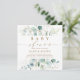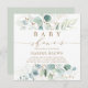 Este convite quadrado de chá de fraldas apresenta cores aquáticas pintadas de eucalipto, folhas botânicas verdes e douradas com guião dourado.