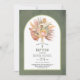 Folhas de palma secas tropicais, erva-pampas e flores de protea, o convite para batismo de um menino verde cinzento. Esta design bonito mostra um quadro de arco sobre fundo verde cinza manchado. No quadro há um buquê de aquarela de palmeiras secas, flores de proteína e capim de pampas.