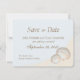 Salve a data com lindas conchas marinhas em uma costa arenosa para complementar nosso convite de casamento na praia de conchas. Personalize o texto conforme preferido.