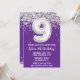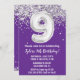 Convite de 9 anos de 9ª Convite de aniversário, roxo e prata, com prata branca preta, com escrevendo moderno e balões de folha divertida.