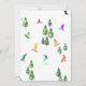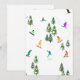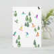 Arte de ilustração caprichosa e legal de snowboarders coloridos, praticando snowboard descendo montanhas entre pinheiros, espruces, árvores de abeto na neve fresca em pó. Snowboard e esporte ao ar livre de Natal em uma floresta de inverno. Presentes para snowboarders. Decoração de Natal para snowboarding.