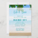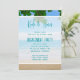 Tema tropical, noivado de casamento, ou chá, convite para o casal. O fundo é uma vista oceânica tropical com areia da praia e água azul. Uma camada branca contém o texto turquesa com script moderno para os nomes do casal no topo. Incluir registro e outras informações na parte inferior, conforme necessário.