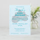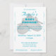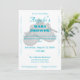 Design features a white background to the image of delicate crocheted baby booties. Text is featured in a bright ocean blue, the name of guest of honor in a large, elegant font. Event type is displayed in a large, bold font. Message, date and time are displayed below in an easy-to-read print. R.S.V.P. information is displayed at bottom. An elegant flourish borders design.