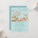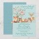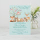 This beautiful baby shower invitation features a fox, two mice, a bunny,, sleeping bear, a deer and little bird who's sitting in the tree. The animals are all wearing floral headbands to the baby shower! The background is pale green with a darker green lettering. An easy to use template is provided for you to enter all of your personal baby shower information. The back side of the invitation has a darker green and white polka dots pattern and another little mouse with a floral headband.