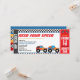 Precisa de quatro bilhetes de corrida de caminhões monstros de velocidade 4.º convite de aniversário desenhado como um bilhete de admissão VIP com caminhões monstros coloridos e bandeira de controlo.