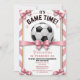 This sporty-chic design features bold pink stripes paired with an adorable bow accent, creating the perfect mix of athletic energy and girly charm. Ideal for little soccer stars who love the game, this invitation sets the tone for a fun “Game Time” birthday celebration filled with goals, giggles, and team spirit.