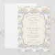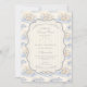 Um doce design inspirado no vintage que apresenta laços azuis delicados, detalhes de listras suaves e ilustrações encantadoras de jardim de mirtilos. Arte no estilo Toile com animais adoráveis e cestas de frutas cria uma sensação clássica de livro de histórias em uma paleta de azul suave em pó. A moldura central ornamentada adiciona elegância, mantendo o visual geral leve, refinado e atemporal. Perfeito para um chá de bebê com um tema de jardim suave e um toque de charme tradicional.