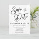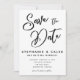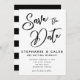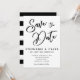 Um clássico e um eterno Salve a placa de data com todo o script preto e um fundo branco com um padrão listrado preto e branco no verso. Simples, limpo e eterno, é um 'Salvar a data' que nunca sairá do estilo.