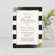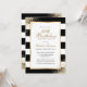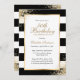 Convite de aniversário elegante preto, branco e dourado com detalhes de aniversário dentro um quadro dourado contra um fundo preto e branco adornado com confete dourado. Convite de aniversário preto e branco. Convite de aniversário em preto e ouro. Personalize facilmente esta modelo a qualquer festa de aniversário.