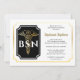 "BSN" e um caduceus com tonalidade dourada num painel de quadros em escala preta à esquerda com os seus detalhes à direita, todos rodeados por uma estrutura de dois bordos recortados com tom dourado num design de convite para festas de formatura de fundo claro que pode ser personalizado para a graduação em escola de enfermagem. Design composto por Holiday Hearts Design (direitos reservados).