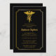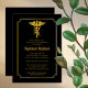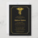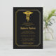 Um "Rx" caduceus dourado e design de convite de festa de formatura preta de moldura escalpada que pode ser personalizado para a graduação em farmácia. Design composto por Holiday Hearts Design (direitos reservados).