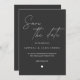 Anuncie seu dia especial em estilo eterno com este cartão de data minimalista preto Salve a data. Projetado com um elegante fundo preto e uma elegante caligrafia branca, ele cria uma ousada mas refinada primeira impressão para o seu casamento. Perfeito para casais planejando um casamento moderno, minimalista ou de gravata negra, esse cartão Salvar a Data complementa qualquer tema sofisticado. Totalmente personalizável com seus detalhes, é parte da coleção Casamento Preto Minimalista, incluindo convites correspondentes, cartões RSVP, menus, programas e gráficos de assentos. Avise aos seus convidados a data da sua celebração com um cartão que seja tão chique e memorável quanto o seu grande dia.
