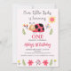 Floral Red Black Our Little Ladybug primeiro aniversario Convite à Senhora Doce O primeiro convite de aniversário para uma menina com uma joaninha fofa, algumas flores e folhagem num fundo rosa pálido. Este convite de primeiro aniversario de joanilha é totalmente editável e pode ser usado para qualquer idade.