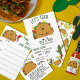 Taco de vamos de fiesta mexicano sobre um jogo de predições de Chás de fraldas de bebês. Com um taco divertido e um cacto fofo na frente. E um padrão mexicano nas costas com taco, nacho, limão, cacto e pimentos coloridos. Design original.