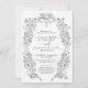 Primavera de fleur de lis estilo elegante, desenhado à mão, fez um convite de casamento com primavera, flores, folhas, guloseimas e pequenas borboletas num fundo branco. Em um tom simples e clássico preto e branco, personalize com seus próprios detalhes de casamento e monograma no topo. Outras cores e itens correspondentes estão disponíveis ou podem ser criados por solicitação. © Desenho manual original e design por Sarah Trett para www.mylittleedenweddings.com no Zazzle.