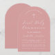 Um convite simples e moderno em forma de arco para a primeira comunhão de menina. Tem apenas texto branco em um fundo rosa dusty rose. Na parte superior há uma cruz com texto arqueado acima dela. A ocasião e o nome são escritos em letra cursiva.