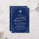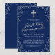 Convite de primeira comunhão para menino com fundo azul-marinho que pode ser alterado para qualquer cor, brilho prateado espalhado elegante, título de folha de prata em script, uma cruz religiosa e um modelo de comunhão que é fácil de personalizar.
