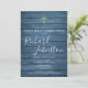 Um convite rústico de primeira comunhão com uma elegante cruz dourada e o nome em letra manuscrita sobre um fundo de painéis de madeira azul. Personalize com as informações do seu evento especial em tipografia sofisticada. Desenhado por Thisisnotme©